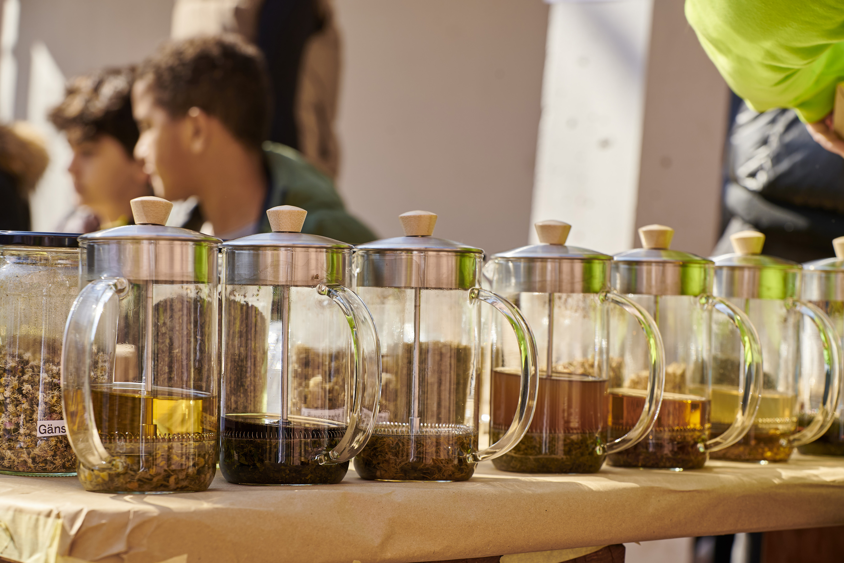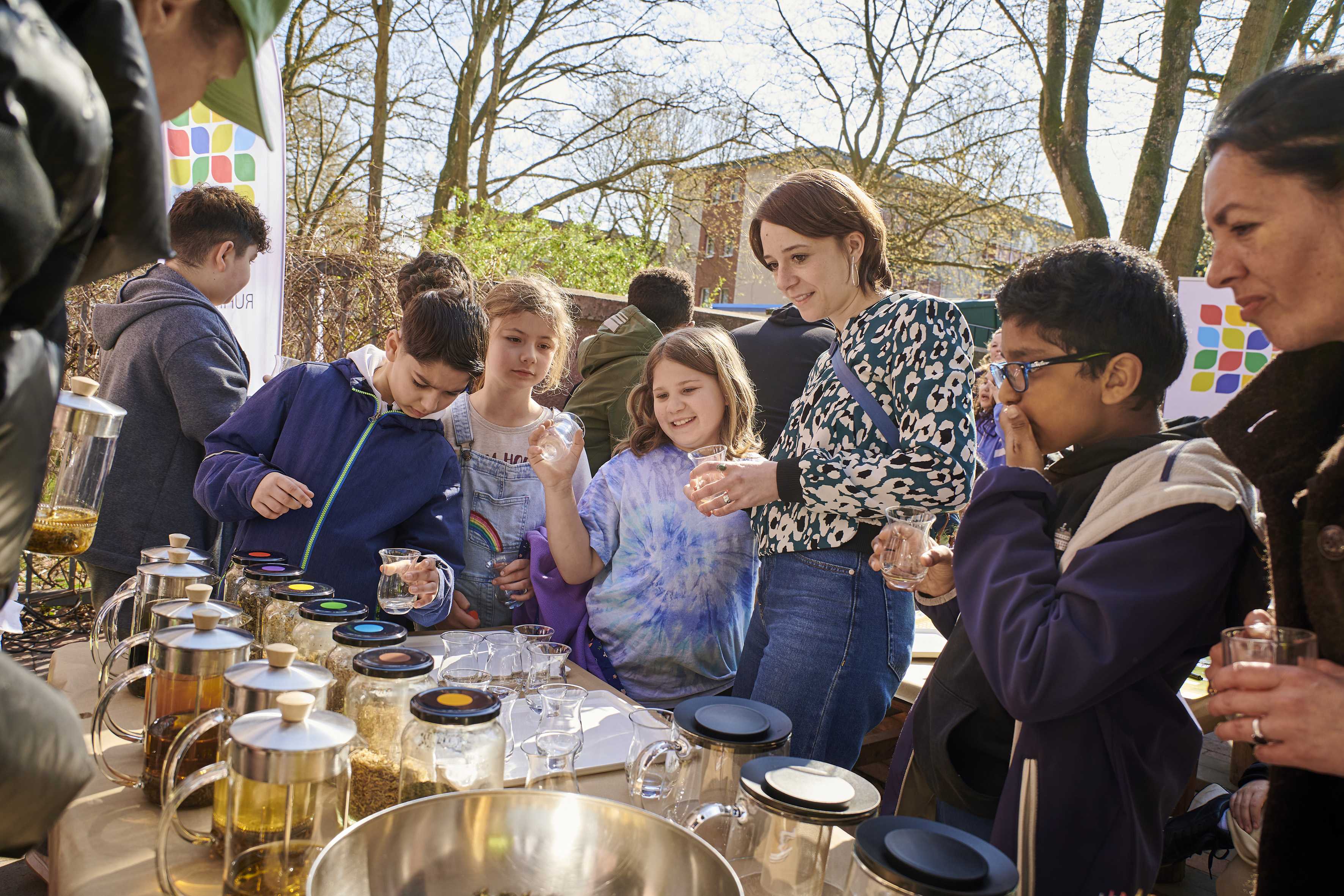 In den Pop-up-Teehäusern wird eine interaktive Ausstellung gezeigt: Wie wurde die Teemischung entwickelt? Welche Bedeutung hat Wasser für das urbane Grün? Vor allem aber bieten sie einen inspirierenden Raum, um bei einer frisch aufgesprühten Tasse Tee miteinander ins Gespräch zu kommen.